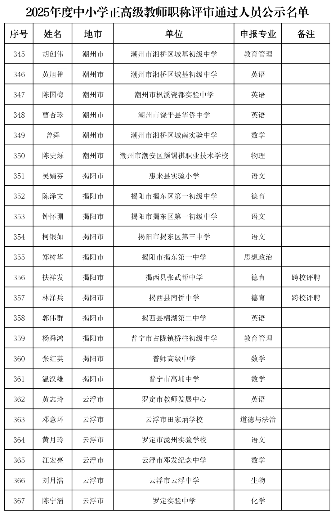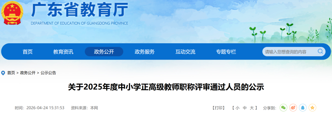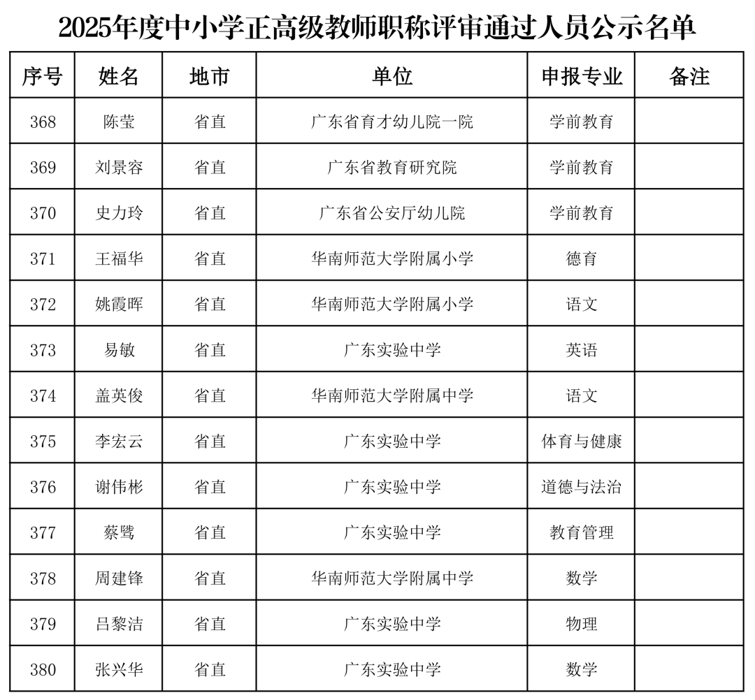 经广东省中小学正高级教师职称评审委员会评审,共有380人通过2025年度中小学正高级教师职称评审(具体名单见附件),现予公示。